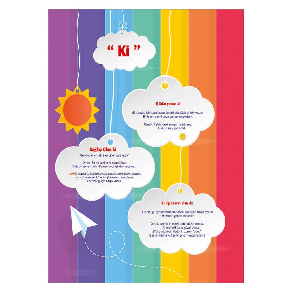 "ki" Ekinin Yazımı Afişi "ki" ekinin ayrı ve bitişik yazılma durumlarını, sıfat yapan "ki", bağlaç olan "ki", ilgi zamiri olan "ki" durumlarını incelemiştir. Türkçe öğretmenleriyle beraber hazırlanan Türkçe Afişleri Okularenkkat farkıyla kısa sürede sizlere teslim edilmektedir.
